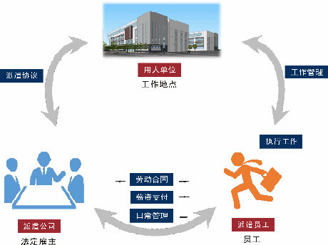 劳务派遣又称人力派遣、人才租赁、劳动派遣、劳动力租赁、雇员租赁,是指由劳务派遣机构与派遣劳工订立劳动合同,把劳动者派向其他用工单位,再由其用工单位向派遣机构支付一笔服务费用的一种用工形式。劳动力给付的事实发生于派遣劳工与要派企业(实际用工单位)之间,要派企业向劳务派遣机构支付服务费,劳务派遣机构向劳动者支付劳动报。